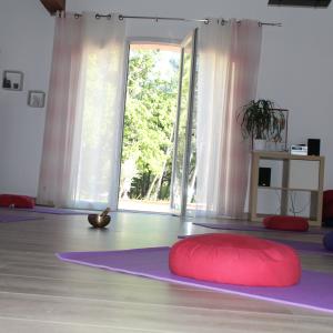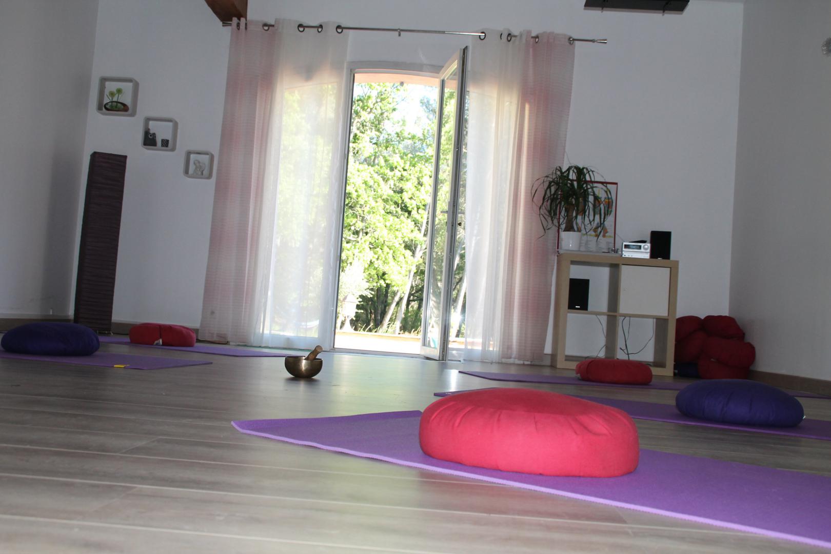 Une salle intérieure équipée (tapis, zafu, plaids…)